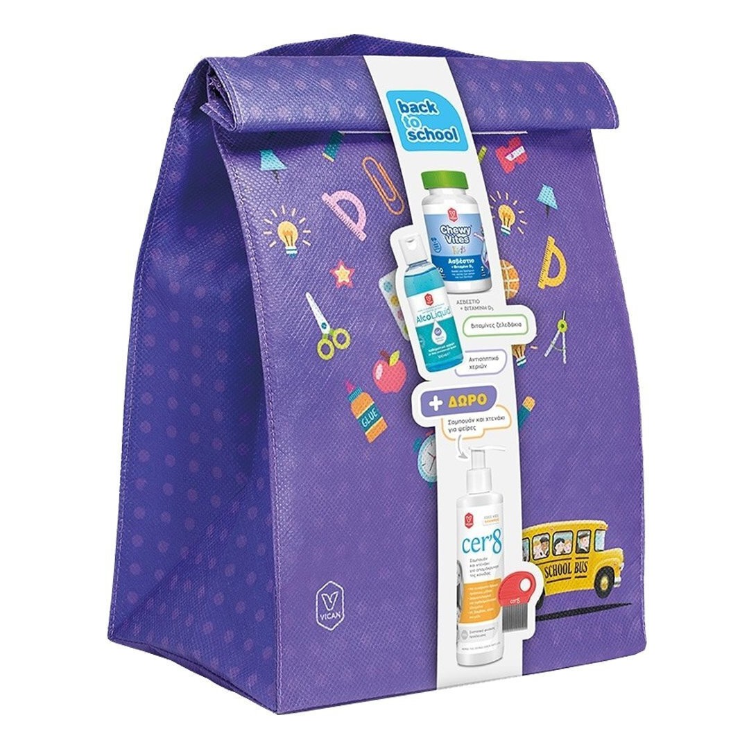Σετ Back to School από την Chewy Vites με παιδικές βιταμίνες με ασβέστιο και βιταμίνη D3, αντισηπτικό χεριών και σαμπουάν για τις ψείρες και τσάντα φαγητού.